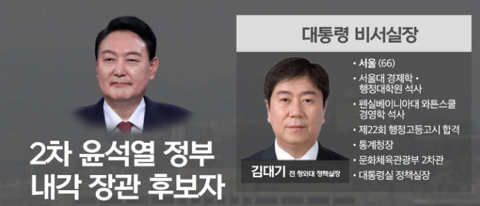 중소벤처기업부 장관 이영 국민의힘 의원을 지명했다. 대통령 비서실장 김대기 전 청와대 정책실장을 지명했다.