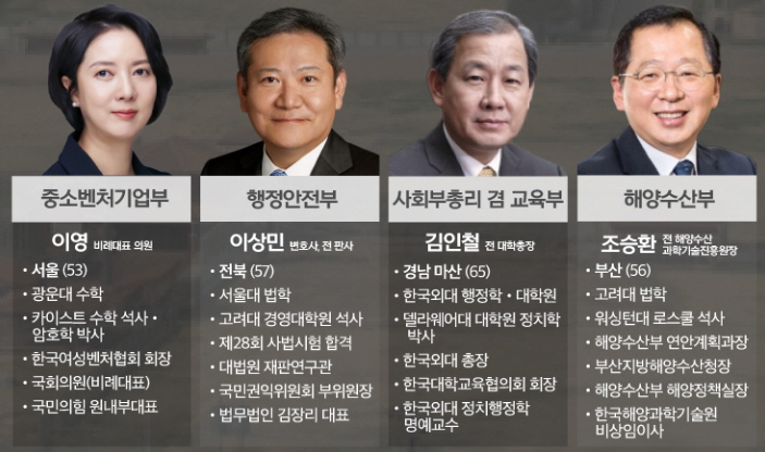 행정안전부 장관 이상민 전 국민권익위원회 부위원장, 환경부 장관 한화진 한국환경연구원 명예연구위원, 해양수산부 장관 조승환 전 해양수산과학기술진흥원장